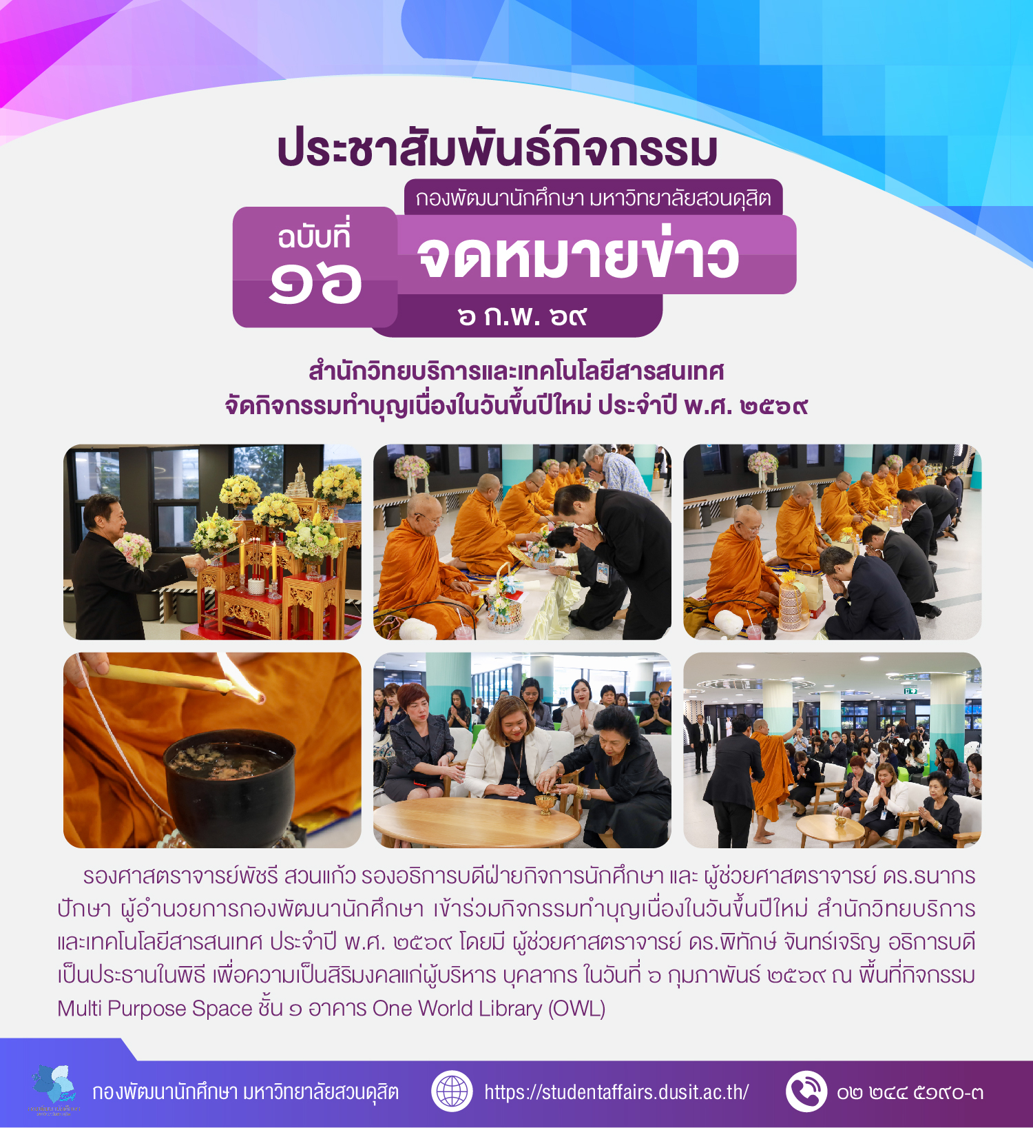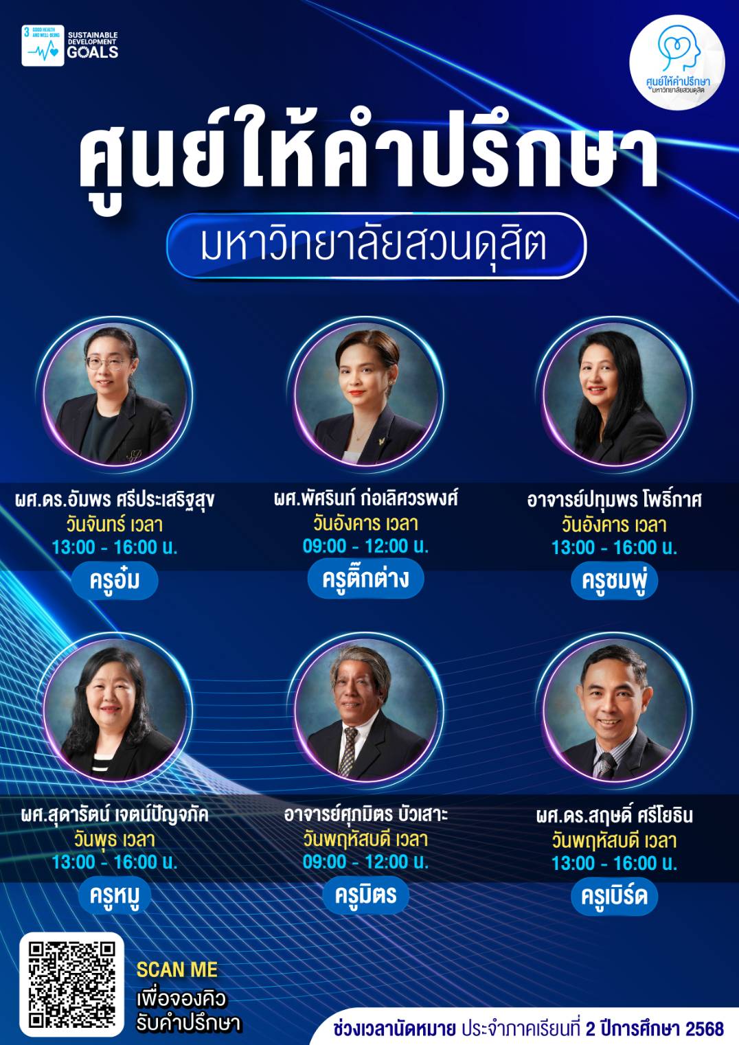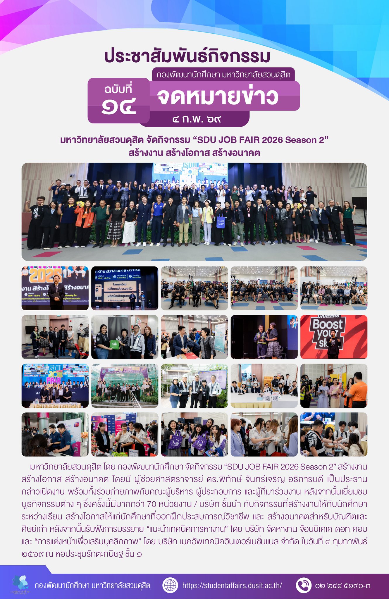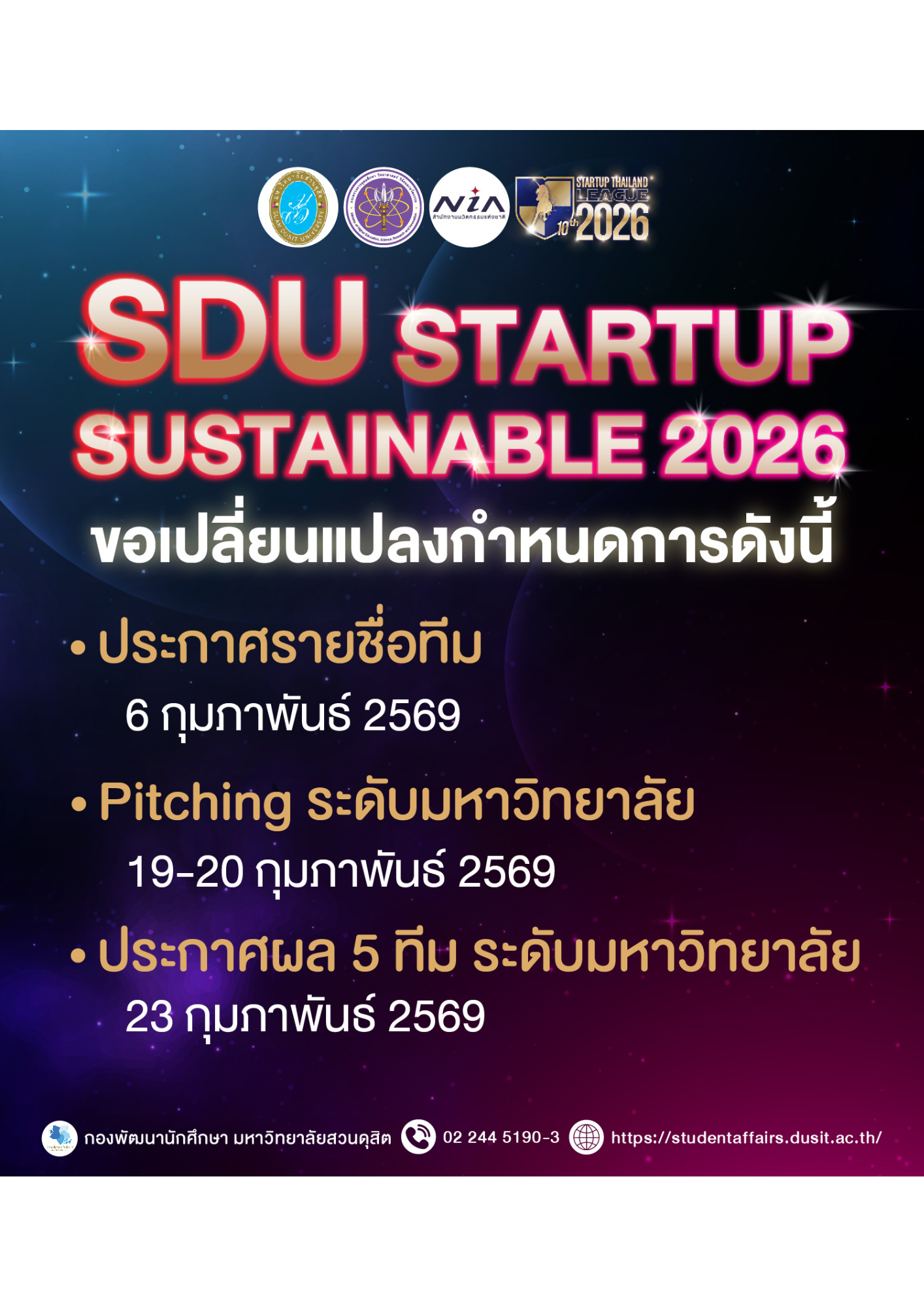 ดูรายละเอรียดรายดูรายละเอียด บริการนักศึกษา Read more ชมรม Read more หอพักใกล้มหาวิทยาลัย Read more ข่าวประชาสัมพันธ์ ภาพข่าวกิจกรรม นักศึกษาสวนดุสิตร่วมปฏิบัติงานคณะกรรมการประจำหน่วยเลือกตั้งPosted on February 20, 2026“อิ่มท้องสมองแล่น เฟส ๕ : อิ่ม ๔ ภาค”Posted on February 20, 2026เทศน์มหาชาติเวสสันดรชาดก ประยุกต์ 2 ธรรมาสน์Posted on February 11, 2026ทำบุญต้อนรับปีใหม่ ๒๕๖๙ สำนักวิทยบริการและเทคโนโลยีสารสนเทศPosted on February 11, 2026HUSO Talk Series : Career Bridge : Learn, Connect & GrowPosted on February 11, 2026SDU JOB FAIR 2026 Season 2Posted on February 11, 2026 Read more จดหมายข่าว กองพัฒนานักศึกษา (อาคาร 2 ชั้น 3)มหาวิทยาลัยสวนดุสิต 295 ถนนนครราชสีมา ดุสิต กรุงเทพมหานคร 10300 : 0 2244-5190-3 : studentaffairs@dusit.ac.th : กองพัฒนานักศึกษา มหาวิทยาลัยสวนดุสิต