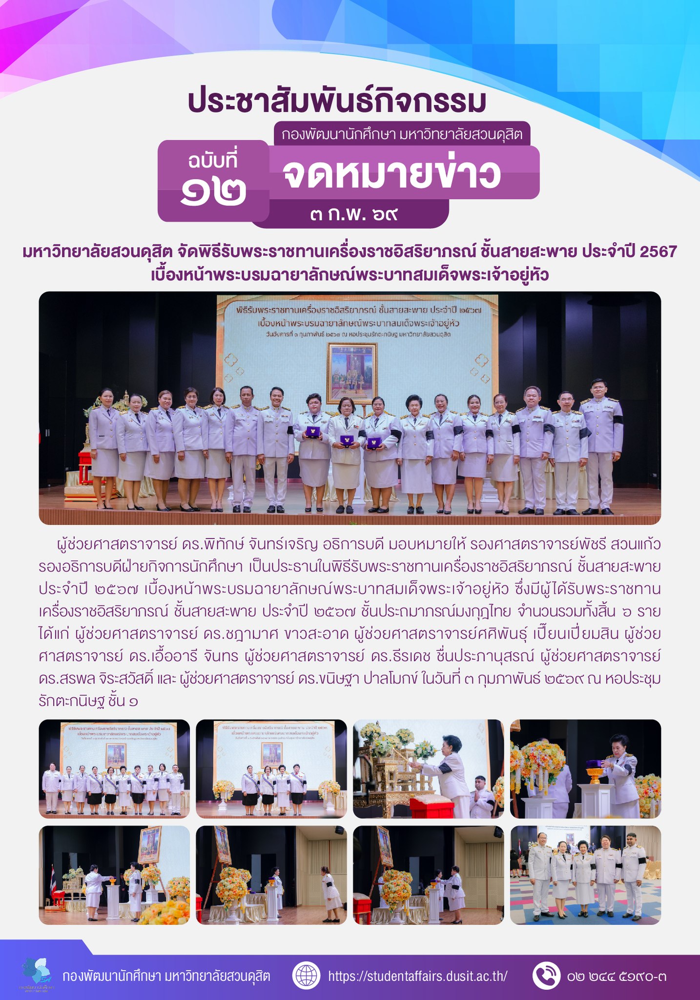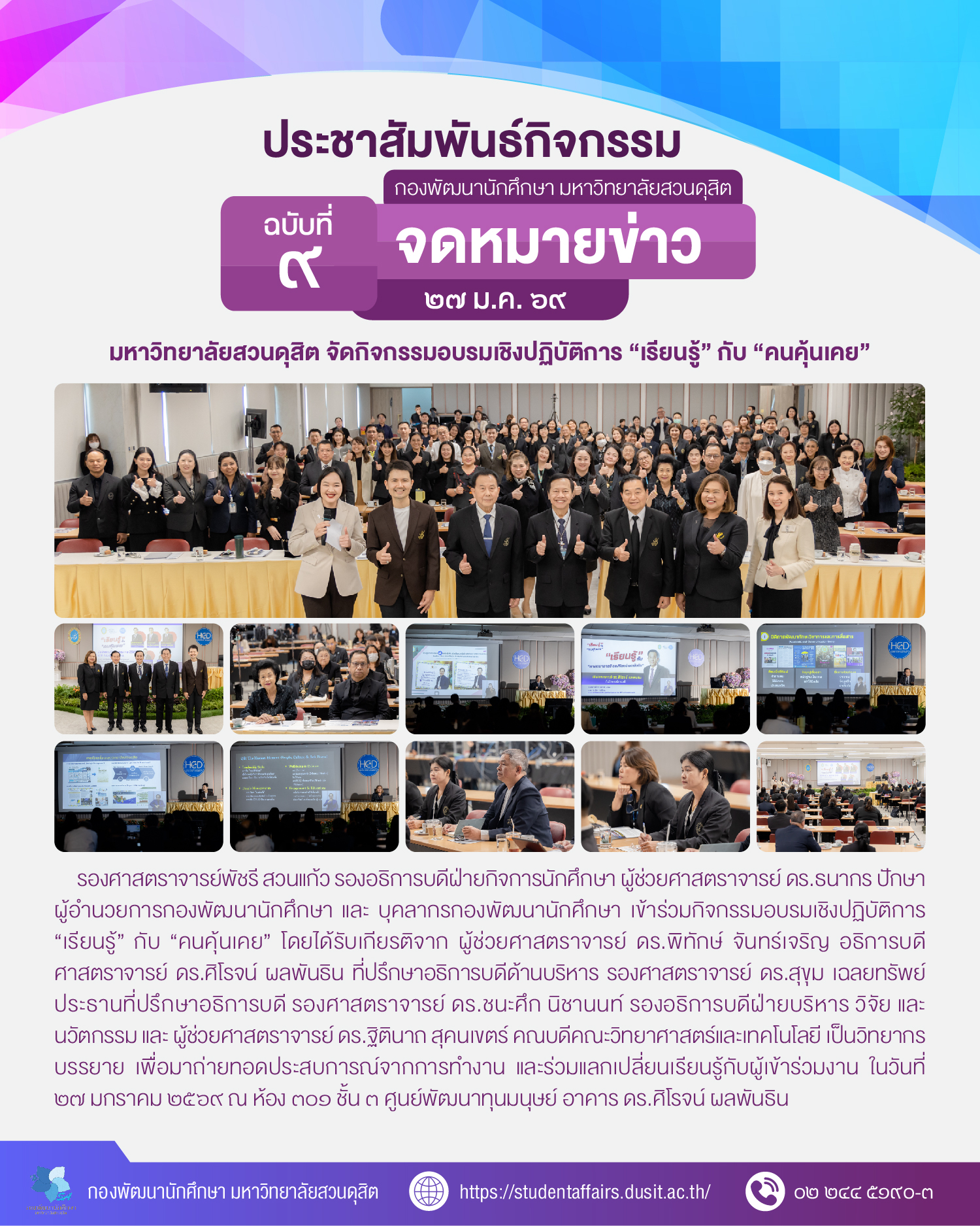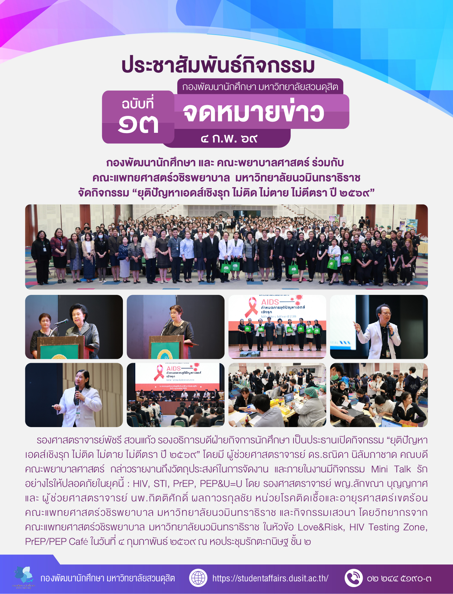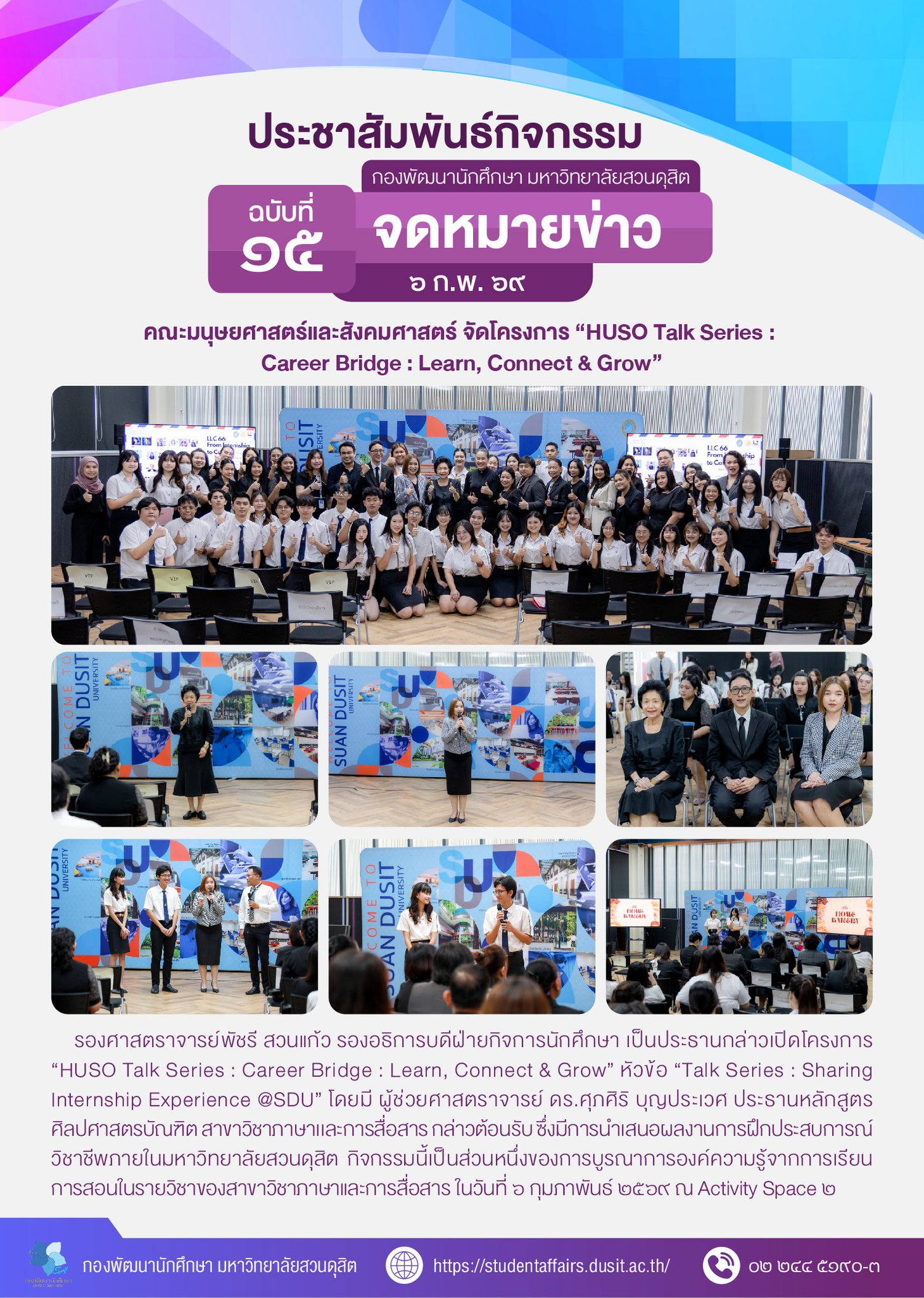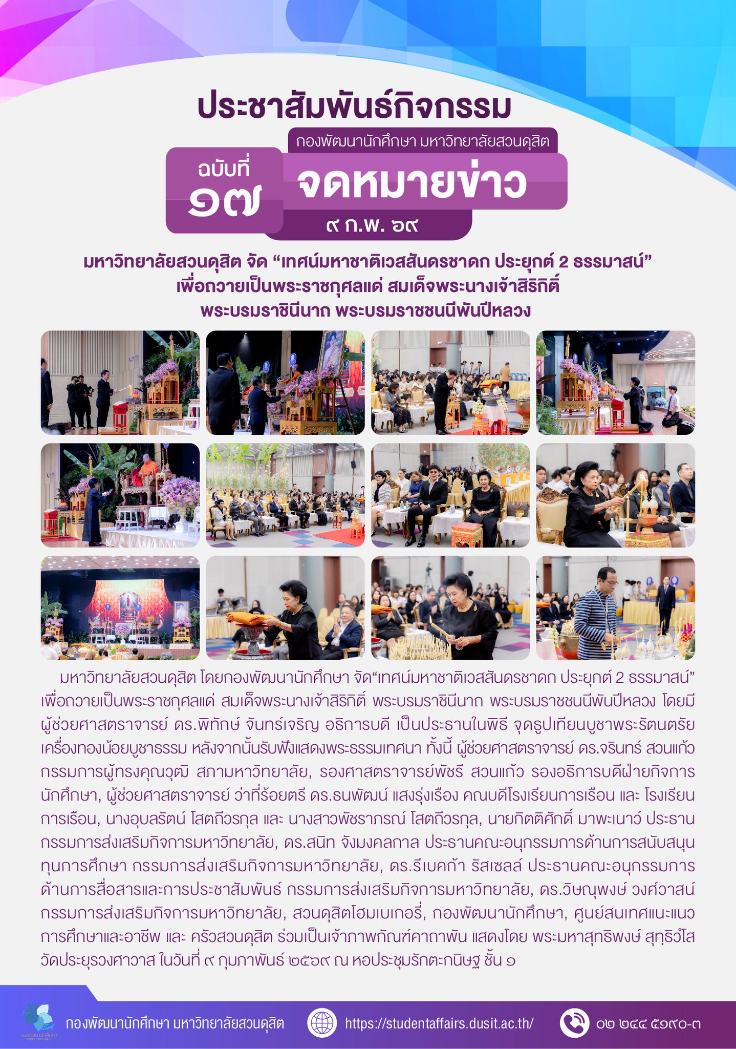 ดูรายละเอรียดรายดูรายละเอียด บริการนักศึกษา Read more ชมรม Read more หอพักใกล้มหาวิทยาลัย Read more ข่าวประชาสัมพันธ์ ภาพข่าวกิจกรรม นักศึกษาสวนดุสิตร่วมปฏิบัติงานคณะกรรมการประจำหน่วยเลือกตั้งPosted on February 20, 2026“อิ่มท้องสมองแล่น เฟส ๕ : อิ่ม ๔ ภาค”Posted on February 20, 2026เทศน์มหาชาติเวสสันดรชาดก ประยุกต์ 2 ธรรมาสน์Posted on February 11, 2026ทำบุญต้อนรับปีใหม่ ๒๕๖๙ สำนักวิทยบริการและเทคโนโลยีสารสนเทศPosted on February 11, 2026HUSO Talk Series : Career Bridge : Learn, Connect & GrowPosted on February 11, 2026SDU JOB FAIR 2026 Season 2Posted on February 11, 2026 Read more จดหมายข่าว กองพัฒนานักศึกษา (อาคาร 2 ชั้น 3)มหาวิทยาลัยสวนดุสิต 295 ถนนนครราชสีมา ดุสิต กรุงเทพมหานคร 10300 : 0 2244-5190-3 : studentaffairs@dusit.ac.th : กองพัฒนานักศึกษา มหาวิทยาลัยสวนดุสิต