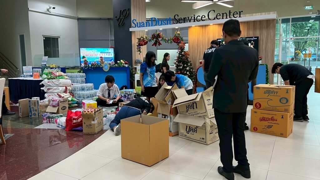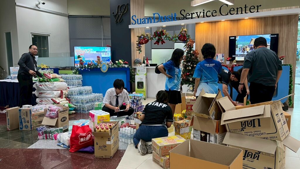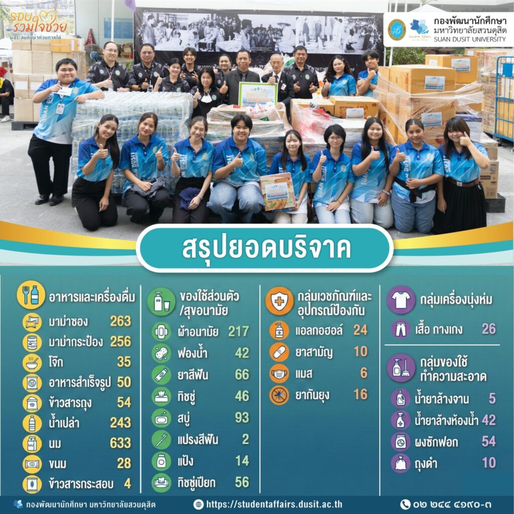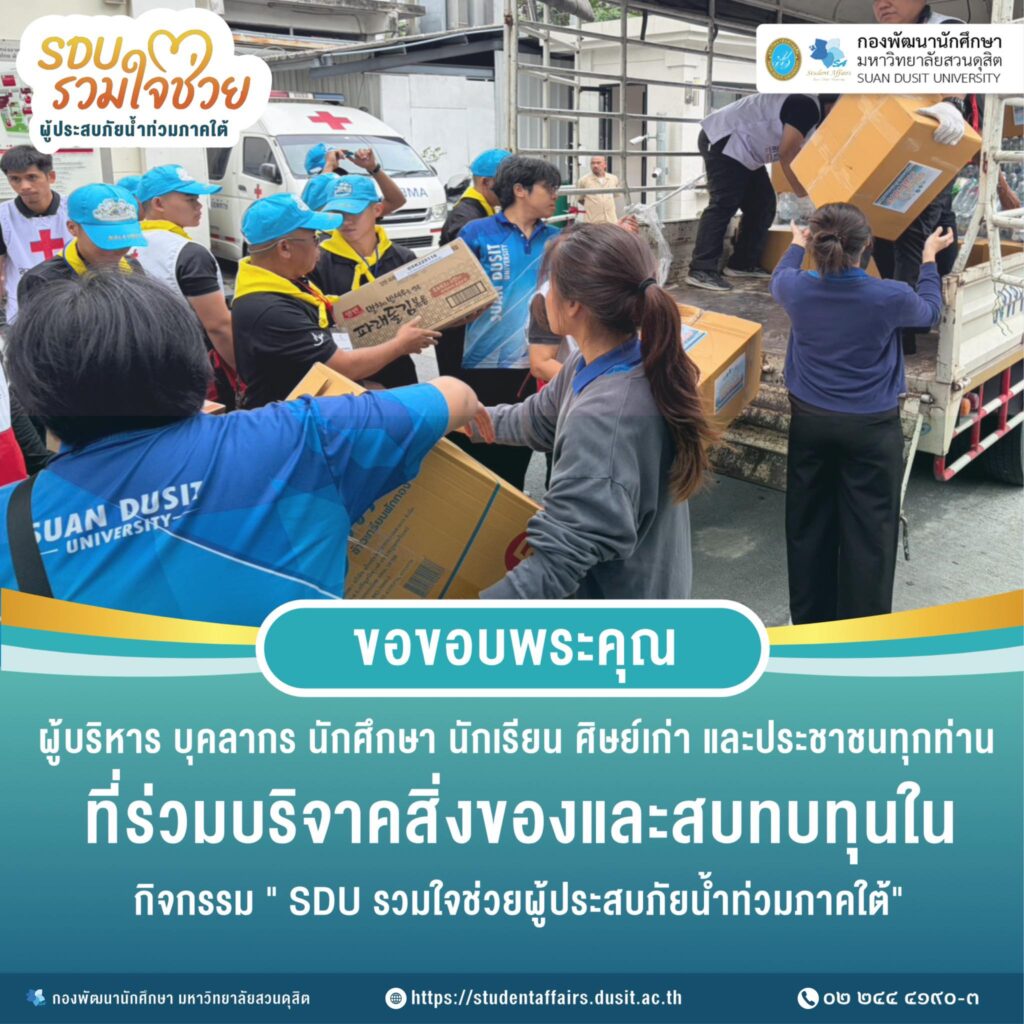 มหาวิทยาลัยสวนดุสิต ขอขอบพระคุณผู้บริหาร บุคลากร นักศึกษา ศิษย์เก่า และประชาชนทุกท่าน ที่ร่วมบริจาคสิ่งของและสมทบทุนในกิจกรรม “SDU รวมใจช่วยผู้ประสบภัยน้ำท่วมภาคใต้”