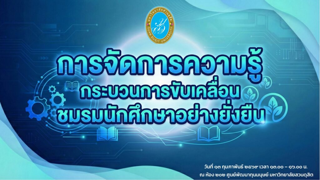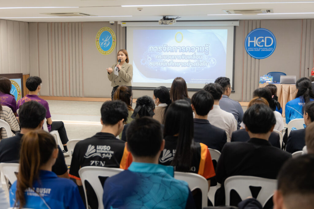 กองพัฒนานักศึกษา มหาวิทยาลัยสวนดุสิต จัดกิจกรรมเสวนา “การจัดการความรู้กระบวนการขับเคลื่อนชมรมนักศึกษาอย่างยั่งยืน” โดยมีวัตถุประสงค์เพื่อส่งเสริมกระบวนการจัดการความรู้ภายในชมรมนักศึกษา สร้างการถ่ายทอดองค์ความรู้จากรุ่นสู่รุ่น ลดความซ้ำซ้อนในการดำเนินงาน และพัฒนาศักยภาพการบริหารจัดการชมรมให้มีความเข้มแข็งและยั่งยืน