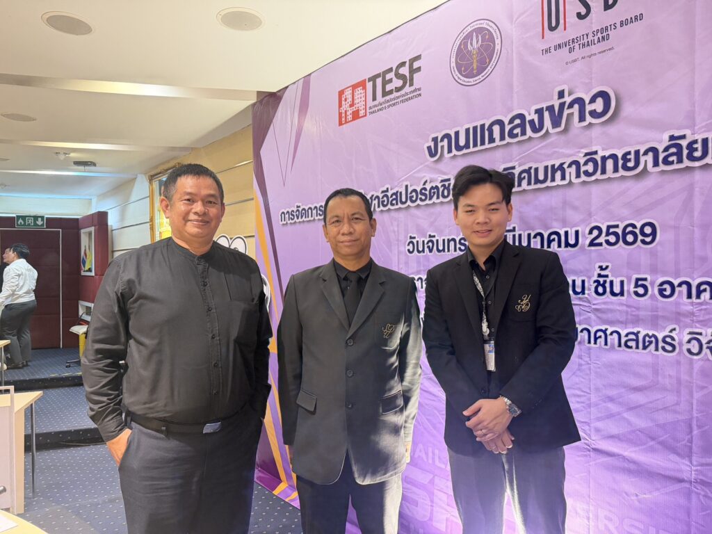 มหาวิทยาลัยสวนดุสิต โดย ผู้ช่วยศาสตราจารย์ ดร.ธนากร ปักษา ผู้อำนวยการกองพัฒนานักศึกษา พร้อมด้วย นายอำนวย วงศ์ประทุม และ นายชนาธิป พยัคฆเพศ บุคลากรจากกองพัฒนานักศึกษาและกองบริหารงานบุคคล เข้าร่วมงานแถลงข่าวการจัดการแข่งขันกีฬาอีสปอร์ตชิงชนะเลิศมหาวิทยาลัยแห่งประเทศไทย ครั้งที่ 1 ภายใต้โครงการ THAILAND UNIVERSITY ESPORTS CHAMPIONSHIP